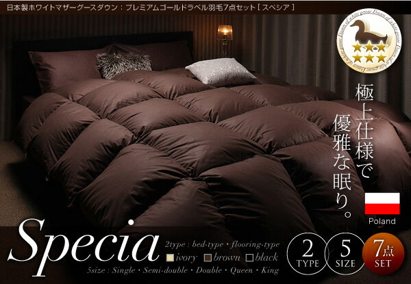 【送料無料】日本製ポーランド産ハンドピックホワイトマザーグースダウン プレミアムゴールドラベル羽毛布団7点セット 「Specia」スペシア 【ベッドタイプ】 <ダブル> 価格: 73,290円 レビュー評価:0.0 レビュー数:0 極上仕様で優雅な眠り。羽毛の確かな品質を保証。六つ星プレミアムゴールドラベル。掛け布団の中身は、ポーランド産ハンドピックホワイトマザーグースダウン95%使用している水鳥の種類はグース。グースはダックよりも体が大きい分、ダウンボールも大きく、“かさ高性”“弾力性”に優れ素晴らしい保温性を有しています。採取はハンドピックと呼ばれる手作業で行われ、傷つけないように上質な羽毛だけを大切に選びとります。特に優れた羽毛だけで作られているからこそ、希少性があり特別なあたたかさを感じられるのです。羽毛掛け布団の優れた“かさ高性”と、確かな品質を認定する「日本羽毛製品協同組合」のかさ高証明である「ロイヤルゴール Supported by 楽天ウェブサービス |